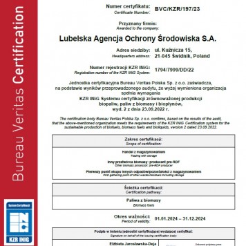 Certyfikat ten pozwala nam potwierdzać spełnienie Kryteriów Zrównoważonego Rozwoju dla partii odpadów przekazywanych w ramach łańcucha dostaw RDF.